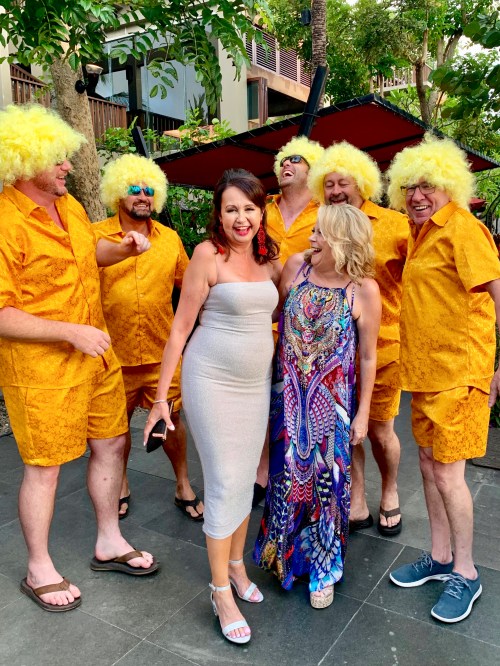 Amanda had caught another chest infection soon after her arrival into Bali the previous week and she was crook. The gold dress that she’d had been excited to have designed and tailored in Bali had near strangled her during the dress fitting so in true Amanda style she simply threw it to one side, got frocked up in another dress and went to the party. Meanwhile Sophia, Fi and I were wanting to throttle the tailor who didn’t seem to understand the importance of the dress to Amanda – we wanted them to go back, fix the problem and come back with the perfect fitting dress for this special event, but our reaction compared to that of Amanda was just another reminder of us sweating the small stuff. Gold dress or no gold dress, it didn’t matter, what mattered was the 50 friends and family who were there .. besides, the fellas in their tailored gold shorts, shirts and wigs provided enough gold glitter for all.