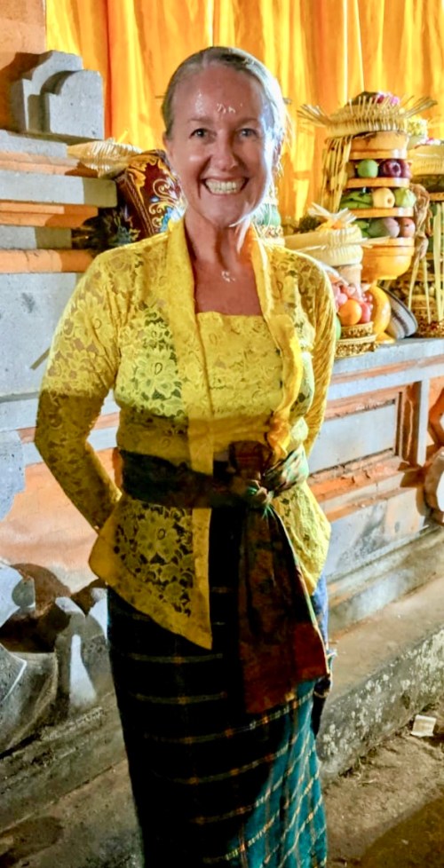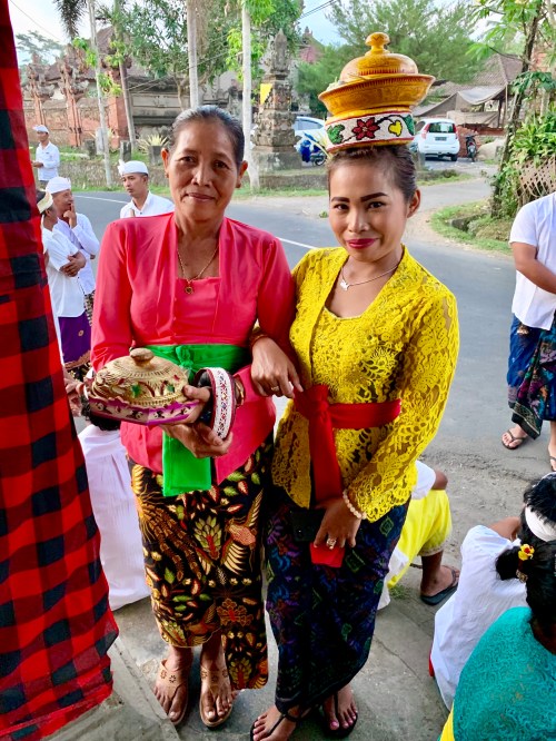 We pulled up at Jero’s home and she quickly whisked me into their family compound to further dress me a tad more appropriate; after all I only had the bottom half traditional Balinese. I met her mother and father and there were kids and people and dogs and chooks and a really lovely atmosphere. She offered several Kebaya to me but they were all too small. After putting the call out to the ladies eventually one came back that fit like Cinderella so we were on. Next was the corset to tidy me in there and again the call went out .. coming back with one that fit. Jero was worried I’d be sick tied in there but we women do many things for fashion and squeezing into clothes was just one skill mastered.